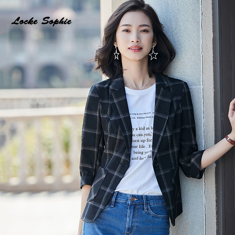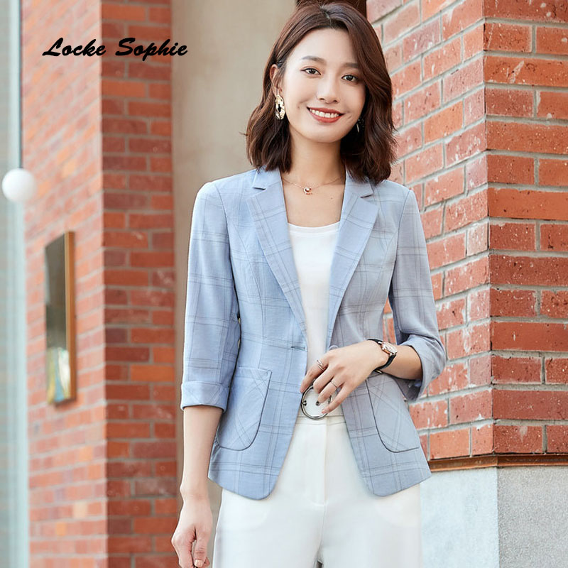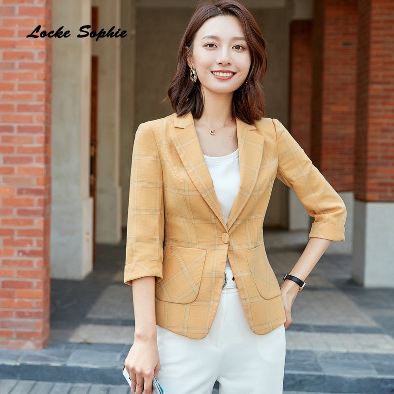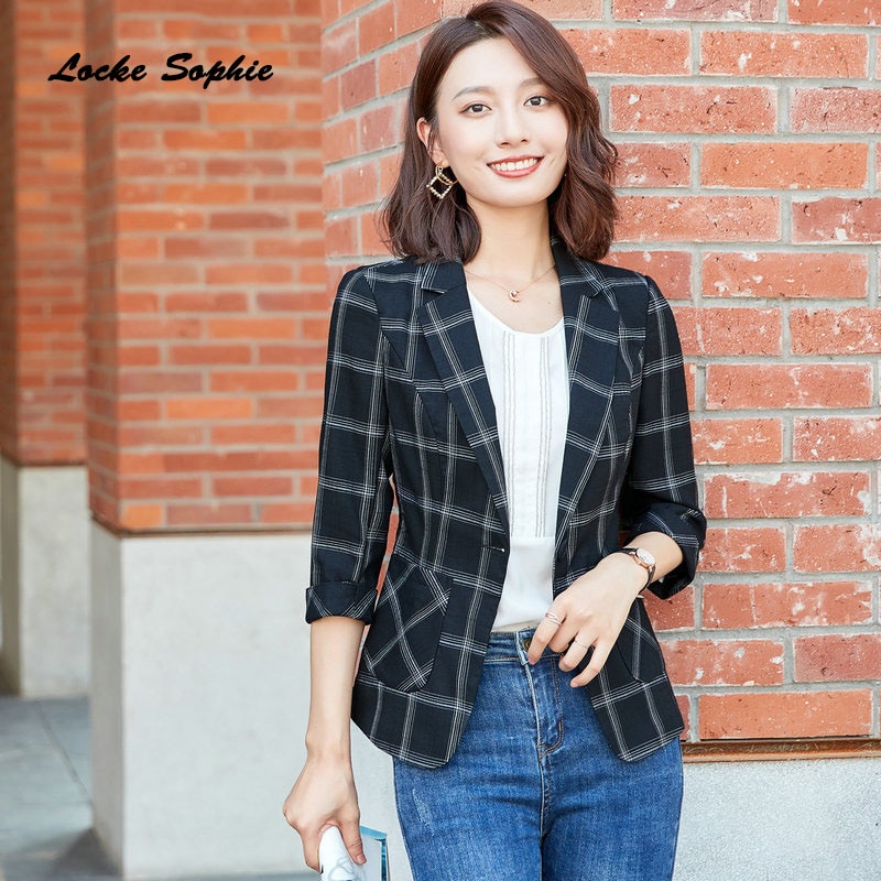 1pcs Women’s plus size Blazers coats 2020 Spring Fashion Cotton plaid Middle sleeve jackets ladies Skinny Small Blazers Suits