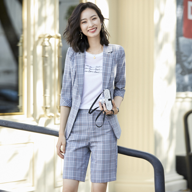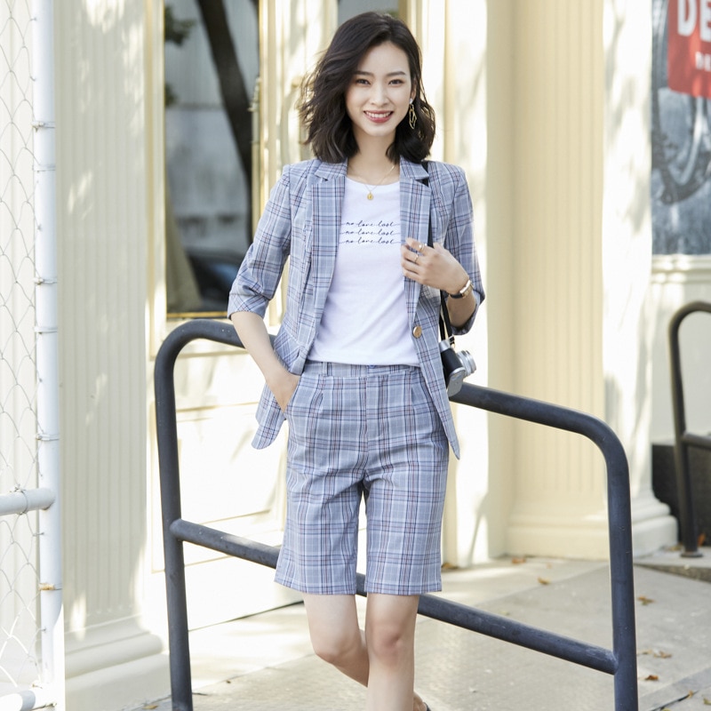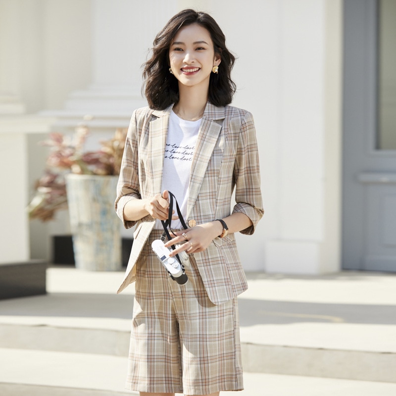 2020 Summer Autumn Plaid Short Pant Suits Women Office Business Suits Uniform Styles Elegant Plaid Pant Formal Work Wear Sets