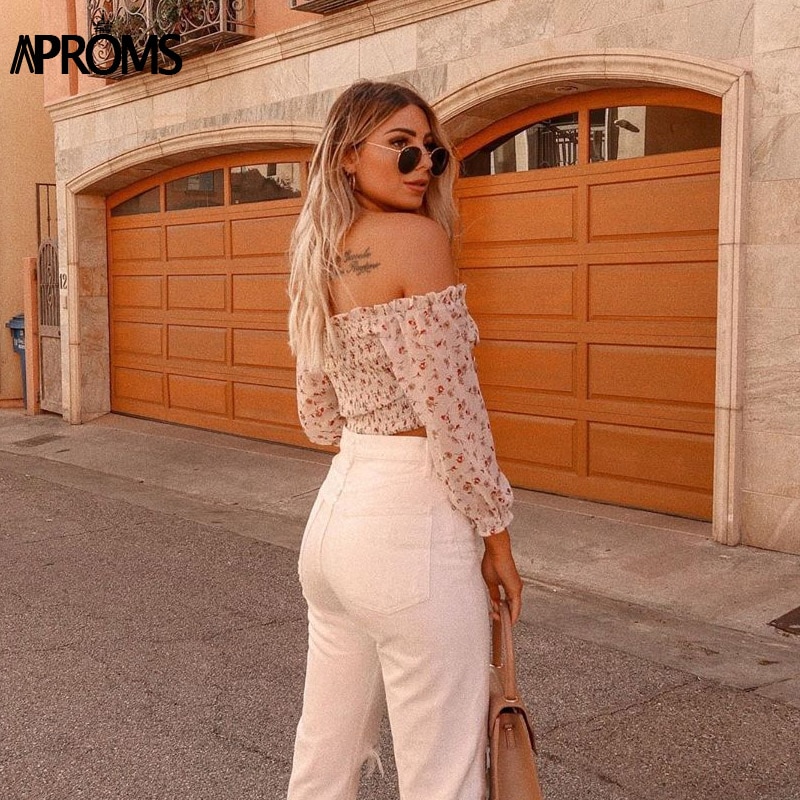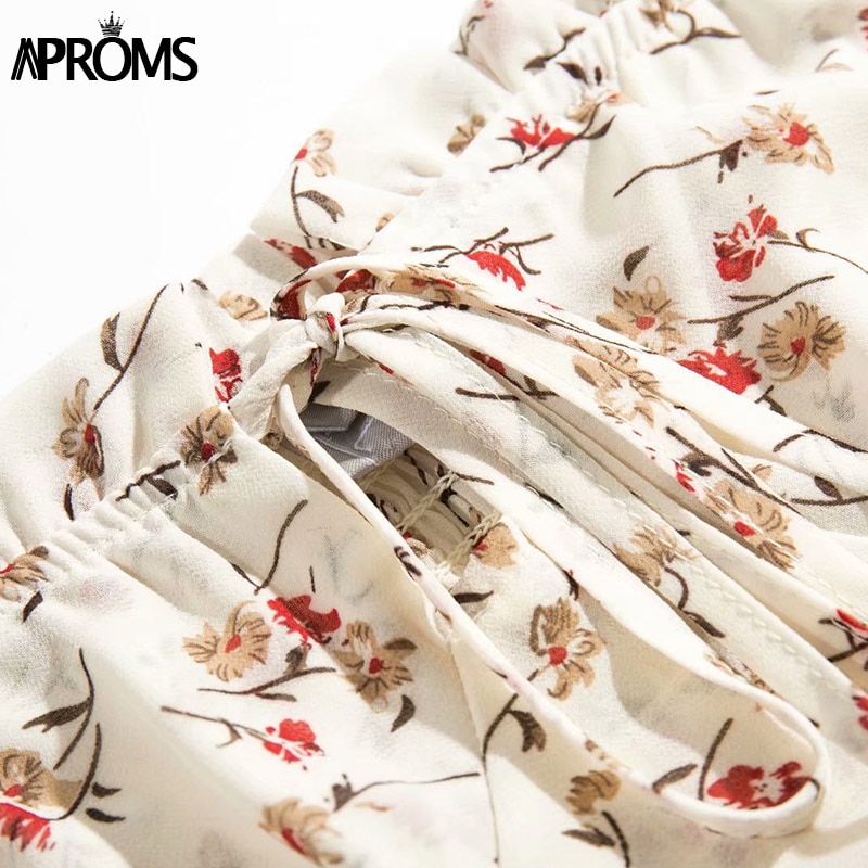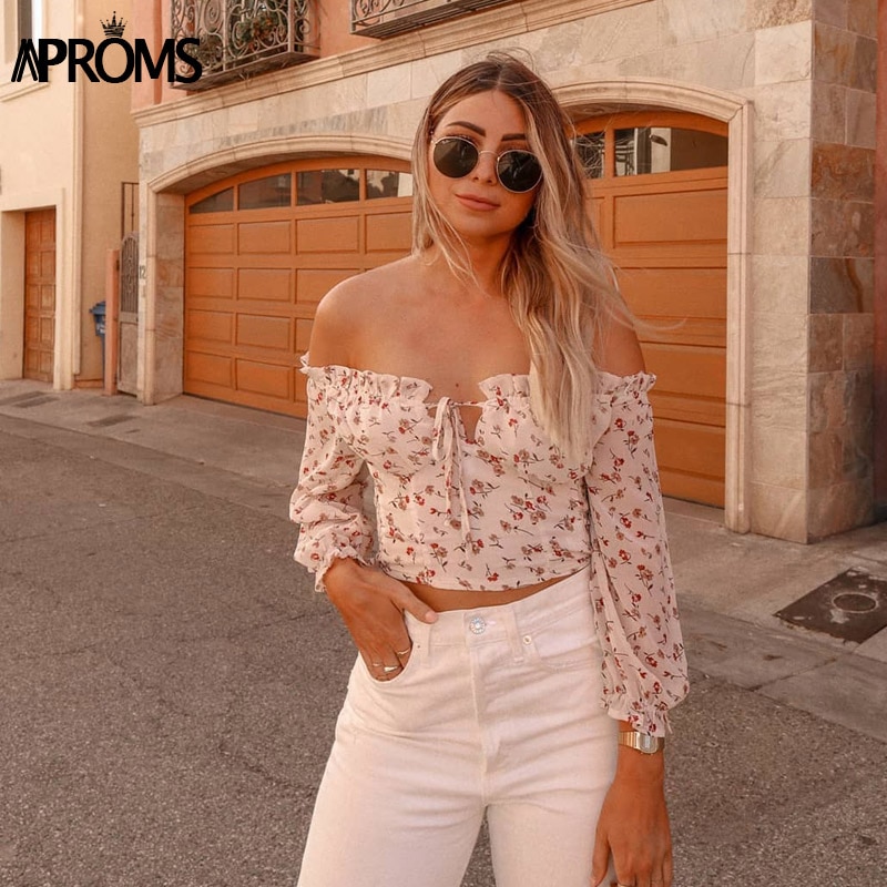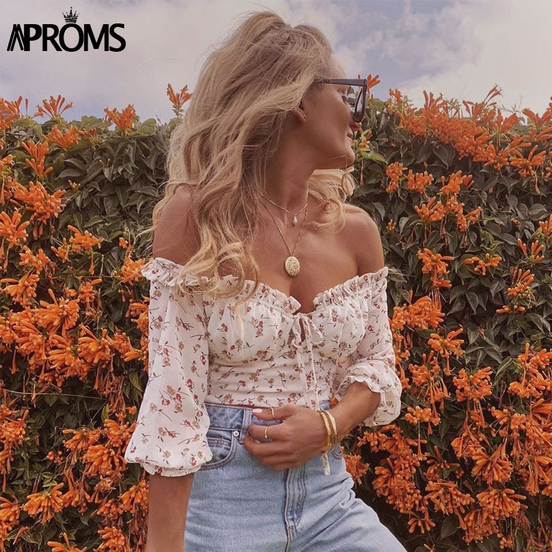 Aproms Vintage Off Shoulder Floral Print Chiffon Blouse Women Casual Bow Tie Front 3/4 Sleeve Shirt Summer Streetwear Top 2020