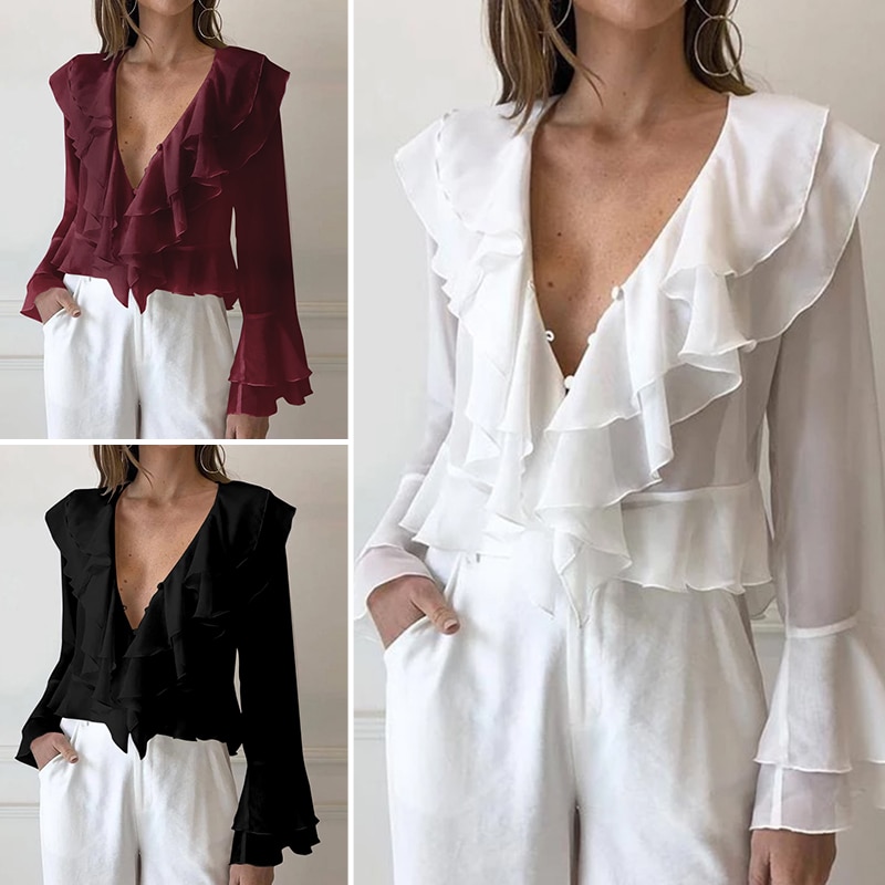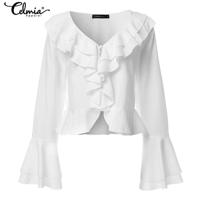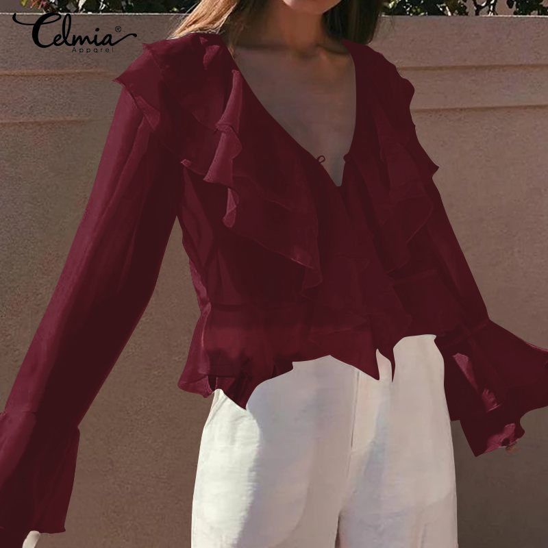 Celmia Women Casual Soild Color Sexy Deep V-Neck Long Flare Sleeve Blouse Fashion Loose Blusas Plus Size Top Shirt Female 5XL 7
