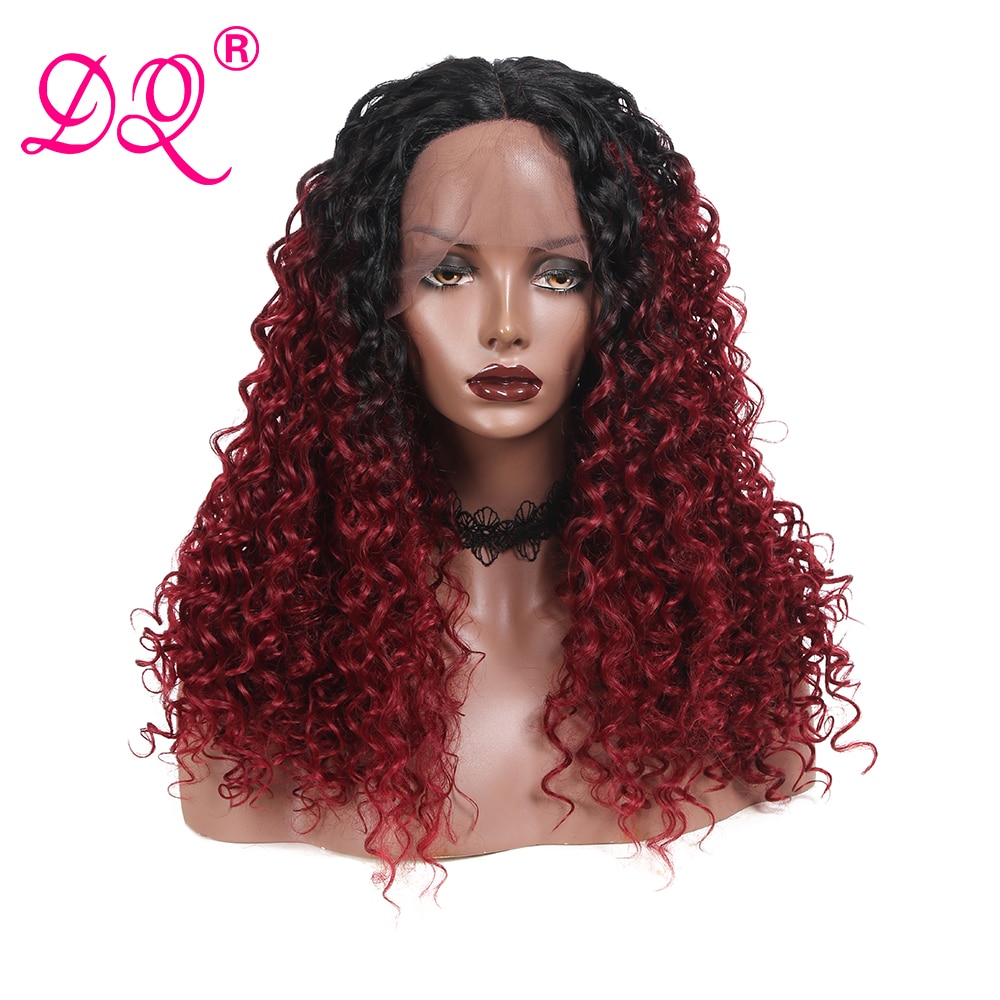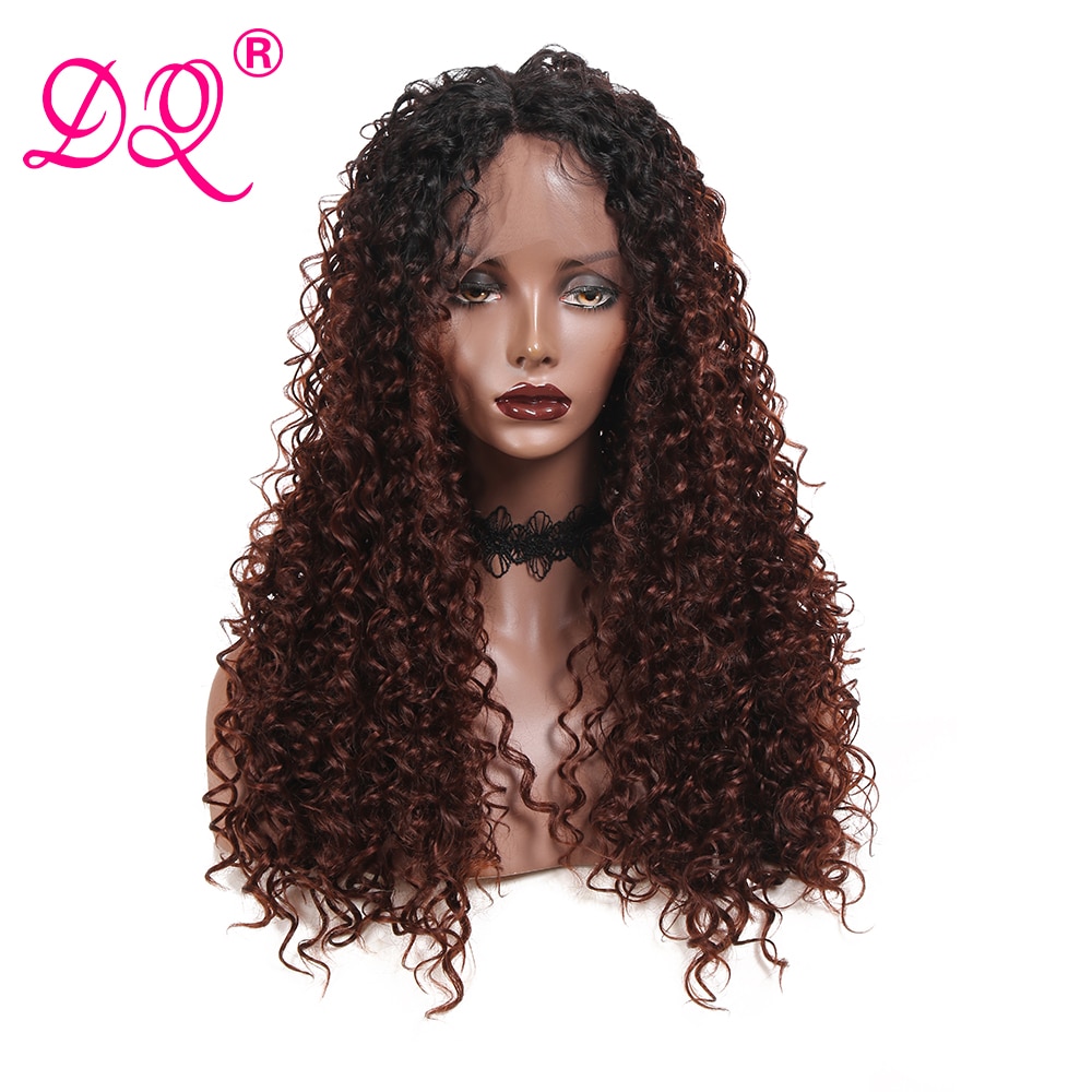 DQ Long Afro Kinky Curly Synthetic Lace Front Wig Women Heat Resistant Fiber Cosplay Wig Ombre Brown Red Black Wig Middle Part