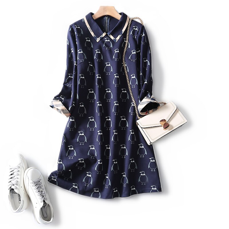 Early autumn new 2019 female fashion penguin pattern stretch Roman cloth light luxury was thin seven-point sleeve dress tide