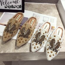 Fur Slides Women Winter Home Shoes Rhinestone Rivets Stud Mules Slippers Pointed Toe Ladies Fashion Slip On Furry Loafers Female