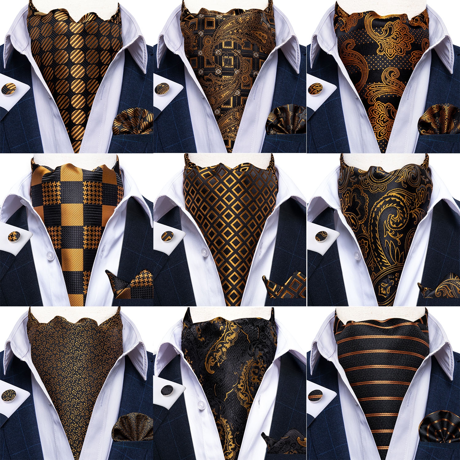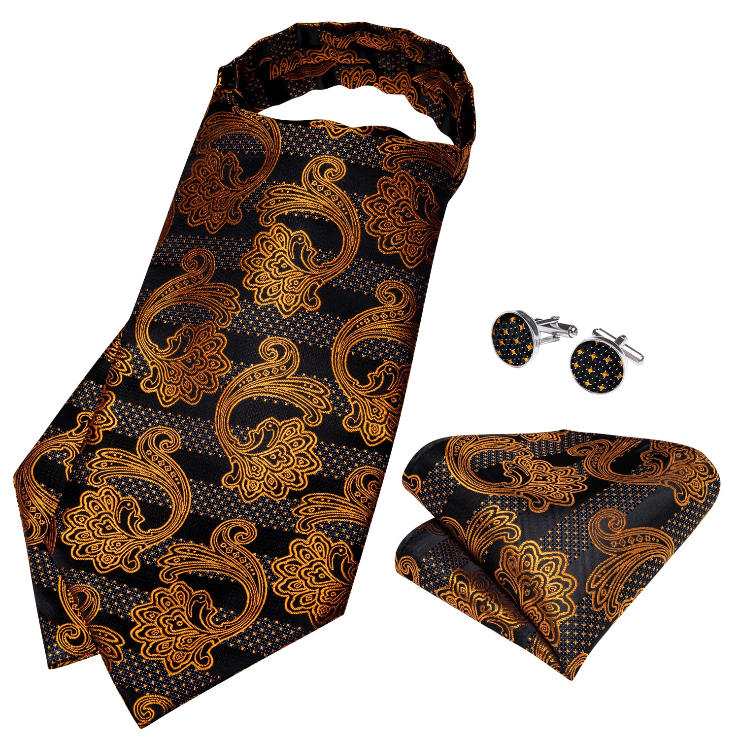 Men Scrunch Self British Style Ascot Neck Tie Vintage Gold Black Paisley Jacquard Woven Necktie Cravat Pocket Square Set DiBanGu