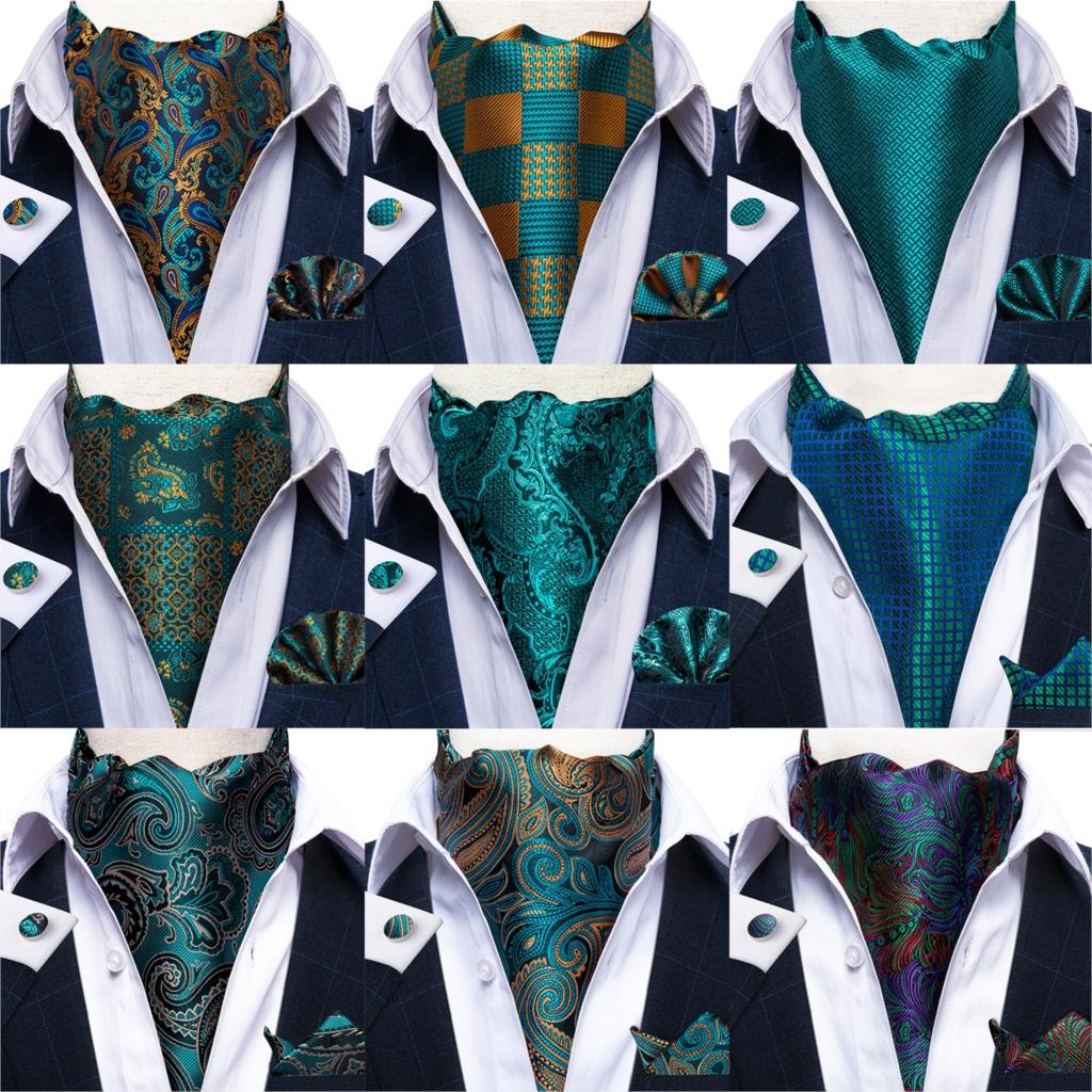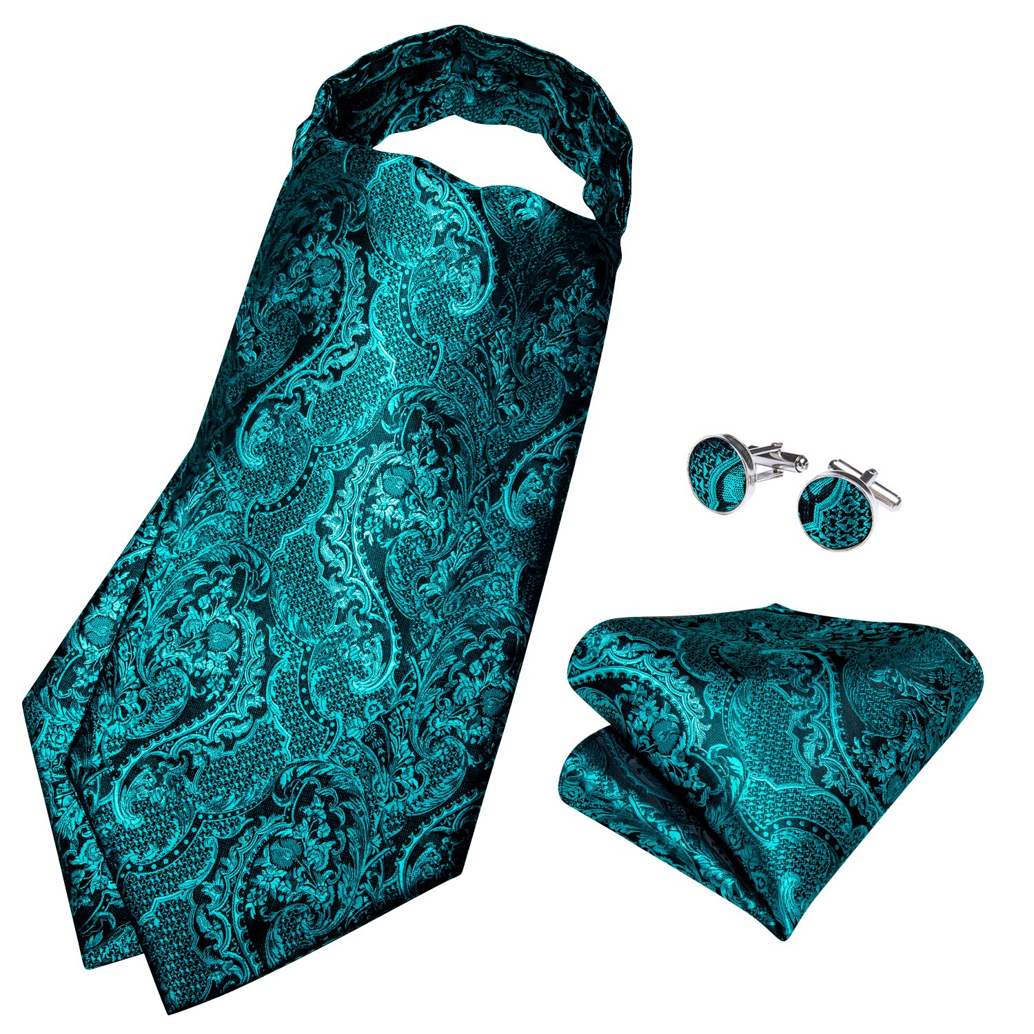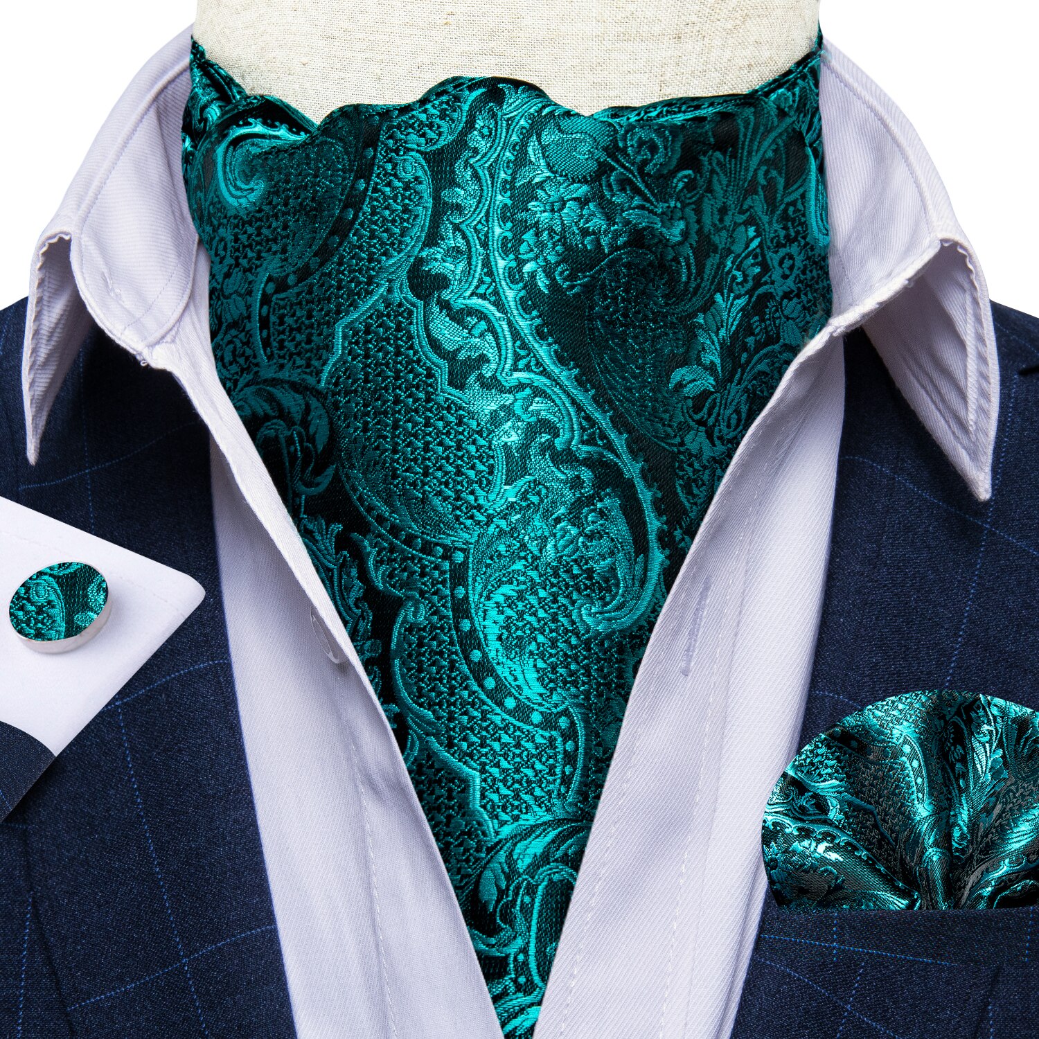 Men Scrunch Self British Style Ascot Neck Tie Vintage Teal Blue Paisley Jacquard Woven Necktie Cravat Pocket Square Set DiBanGu