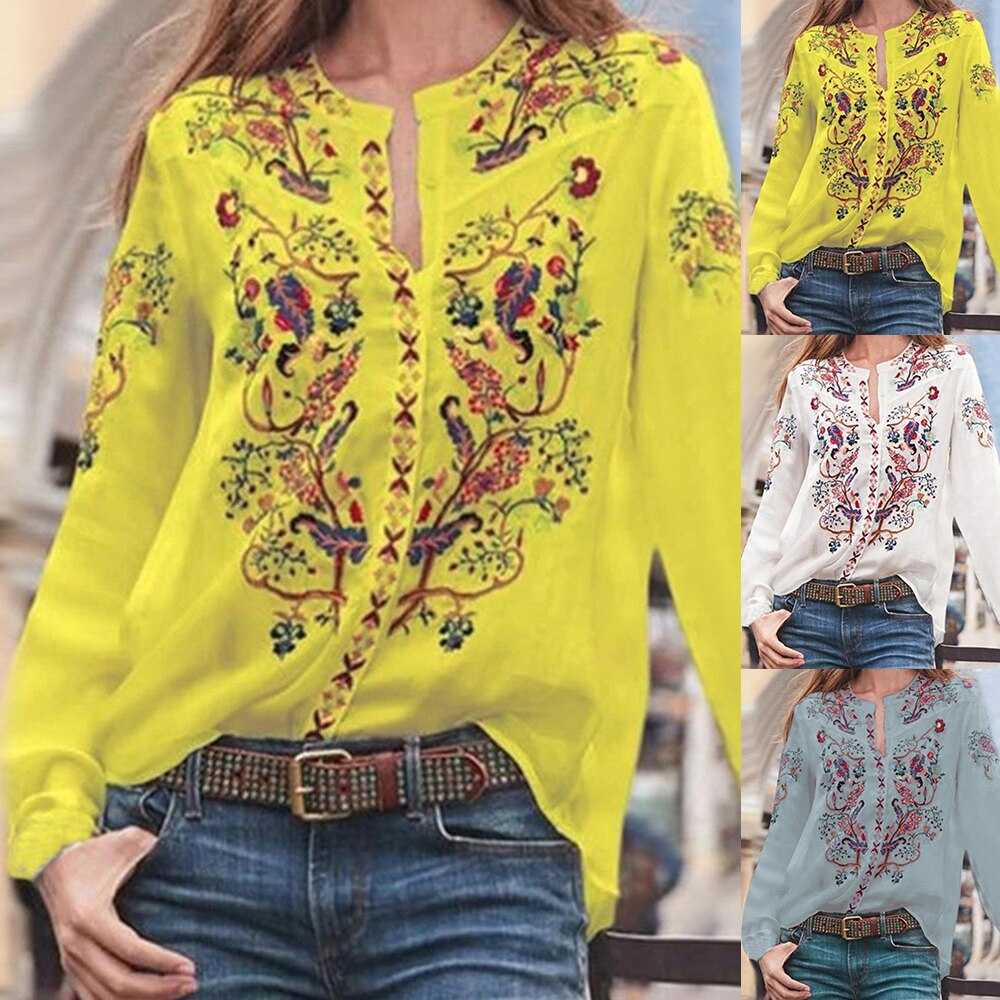 MoneRffi Bohemian Printed Tops Women’s Spring Blouse Fashion V Neck Long Sleeve Shirts Female Casual Blusas Plus Size Tunic 2020