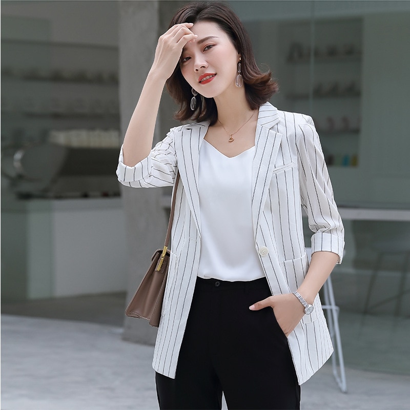 New 2020 Black White Female Elegant Striped Womens Women Blazers Casual Long Blazer Dress for Lady Blazers and Jackets Coats 600