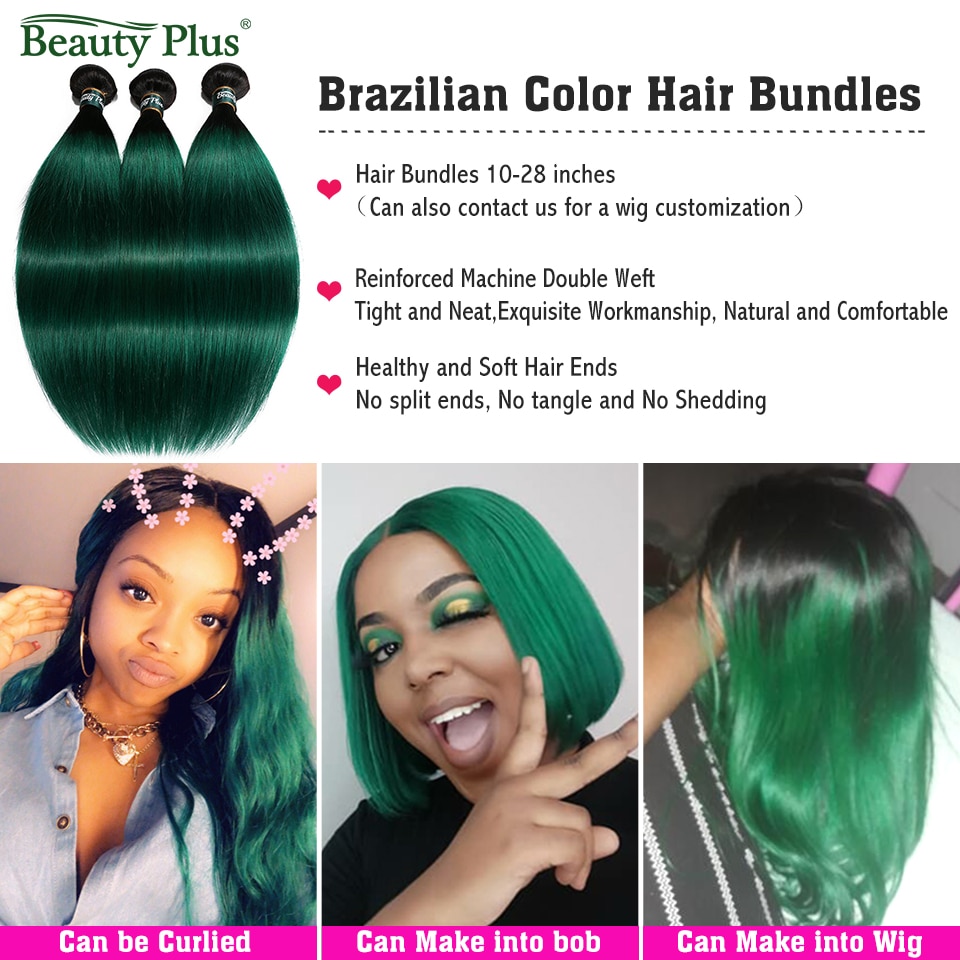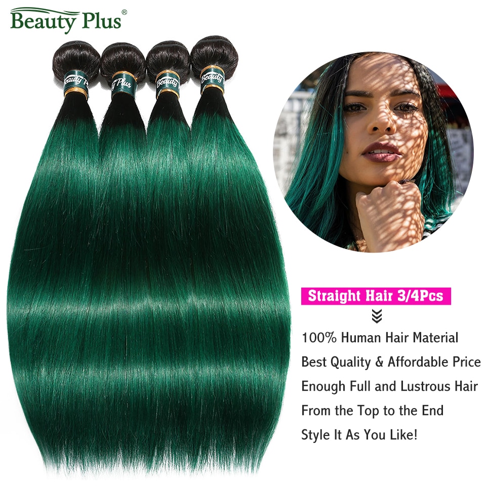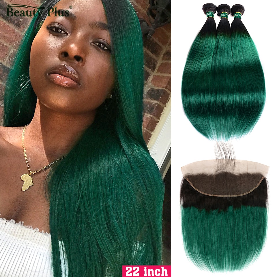 Ombre Bundles With Frontal Beauty Plus Non-Remy Pre Colored 2 Tone Green Human Hair Straight Weaves and Ear To Ear Lace Frontals
