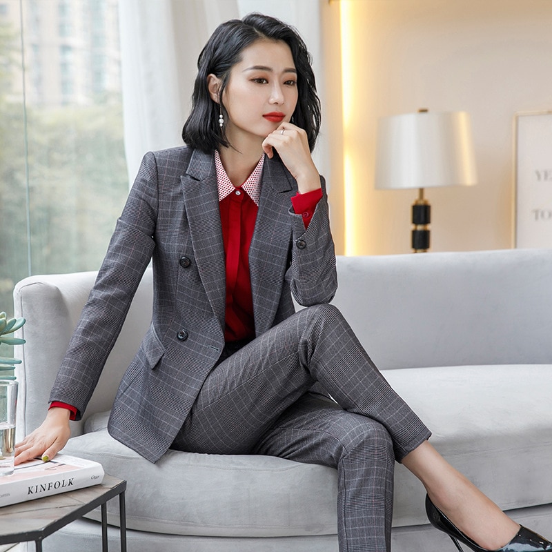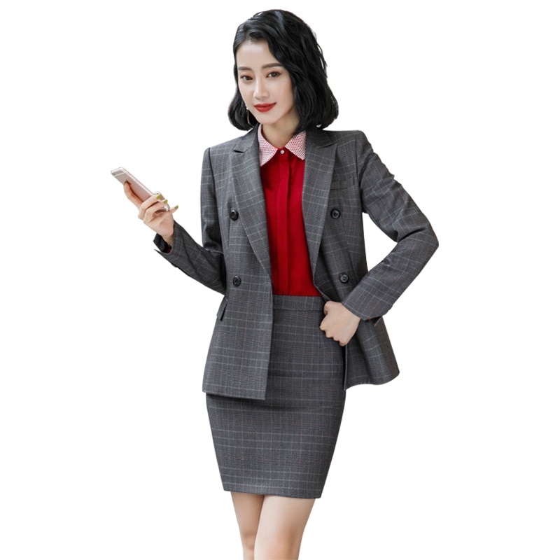 Plaid Formal Elegant Uniform Styles Blazers Suits Two Piece with Tops and Skirt for Ladies Office Work Wear Jacket Blazer Sets