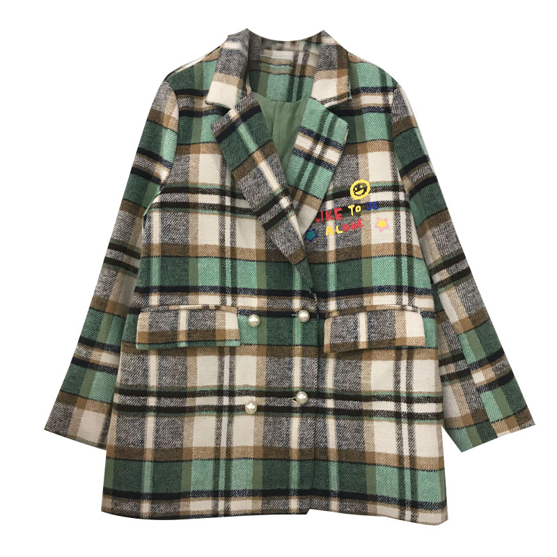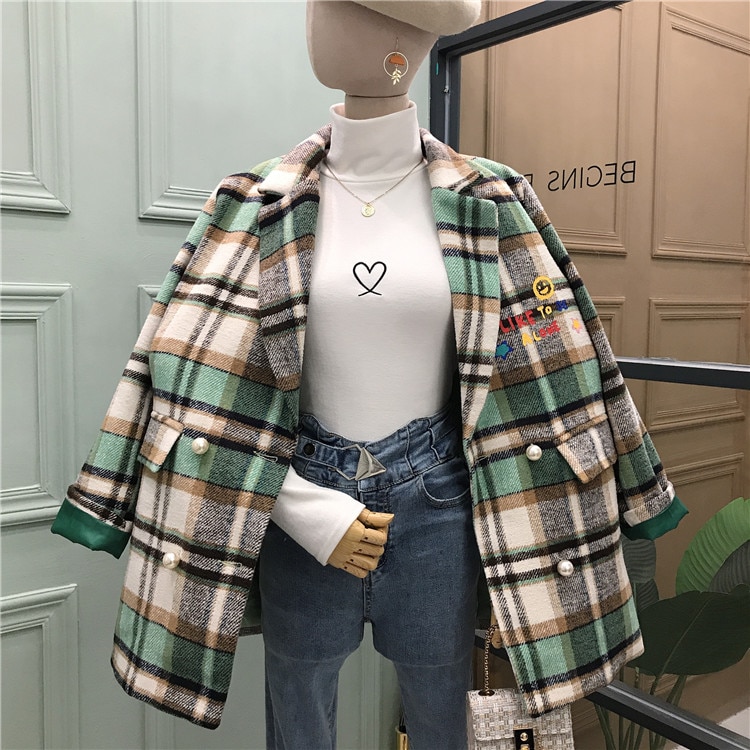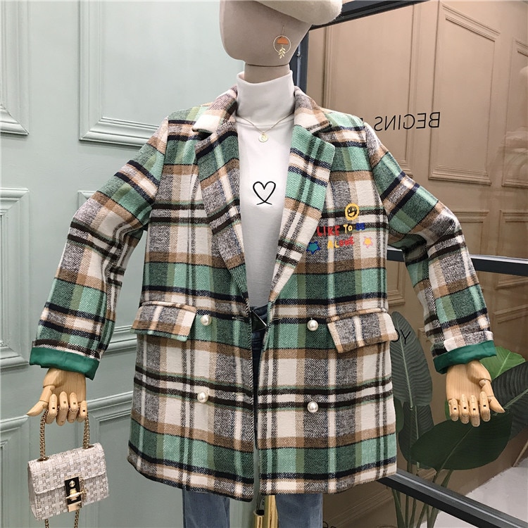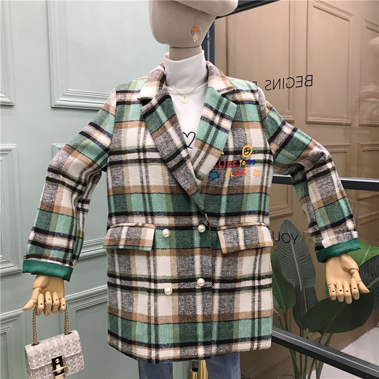 Plaid Women Blazers Double Breasted Notched Embroidery Casual Women Blazers and Jackets Korean Fashion Clothing