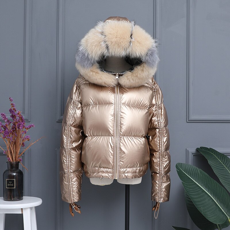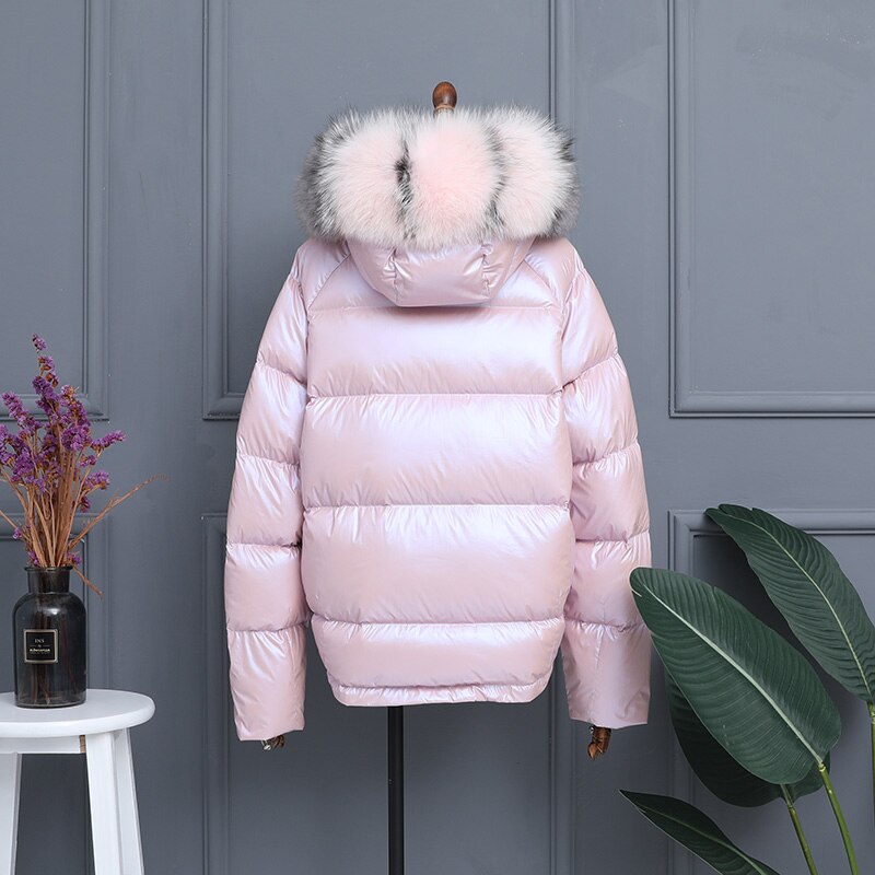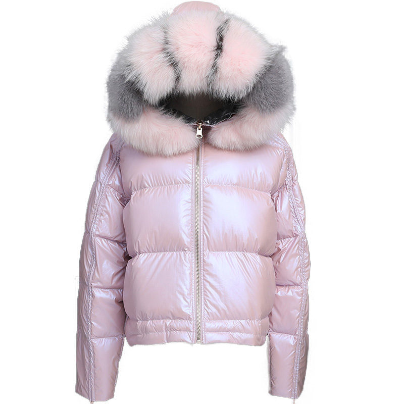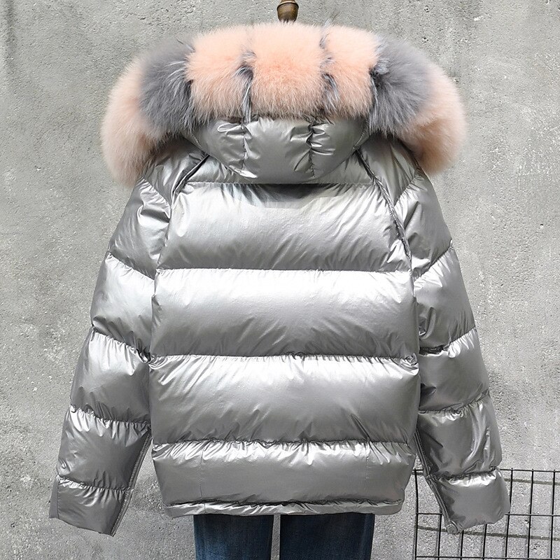 Real Fur Hooded Down Jacket Coat Women Bubble Thick Warm Sliver Black Shiny Korean Glossy Pink Women Winter Down Jacket Coat