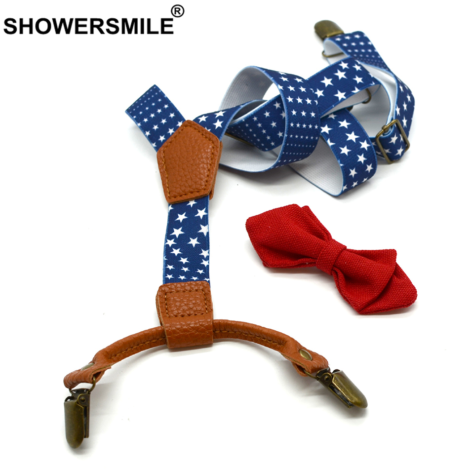 SHOWERSMILE Bow Tie Suspenders Boys Fashion Kids Suspenders Set Elastic Designer Suspenders 4 Clips Children Stars Print Party