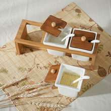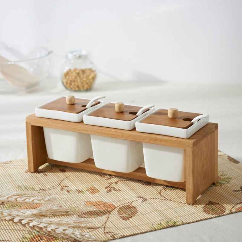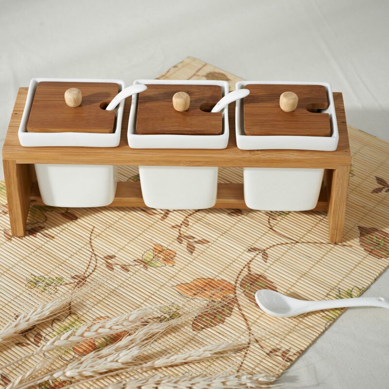 Spice Tools Herb Container 3Sets/Pack Seasoning Ceramic Spice Jar Spoon Bamboo Rack Holder Salt Pepper Flavoring Bottle