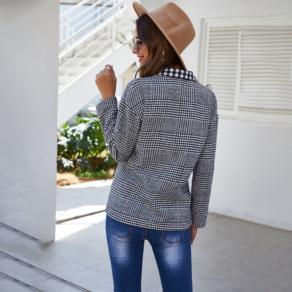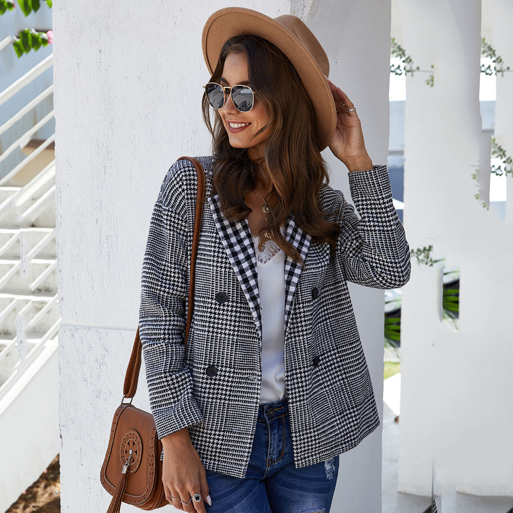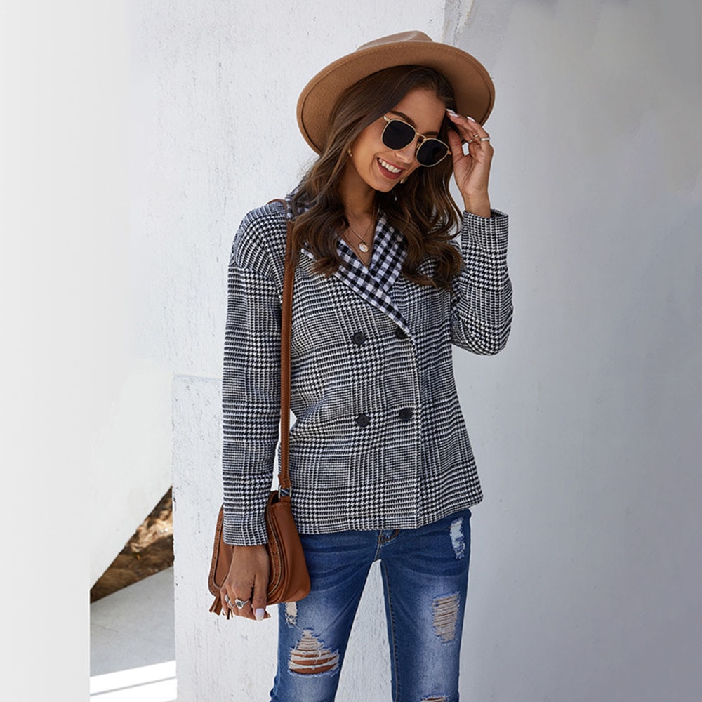 Spring 2020 New Fashion Brit Graphics Casual Blazer Women’s Plaid Double-Breasted Lapel Leisure Blazer Tailored Coats Bussiness