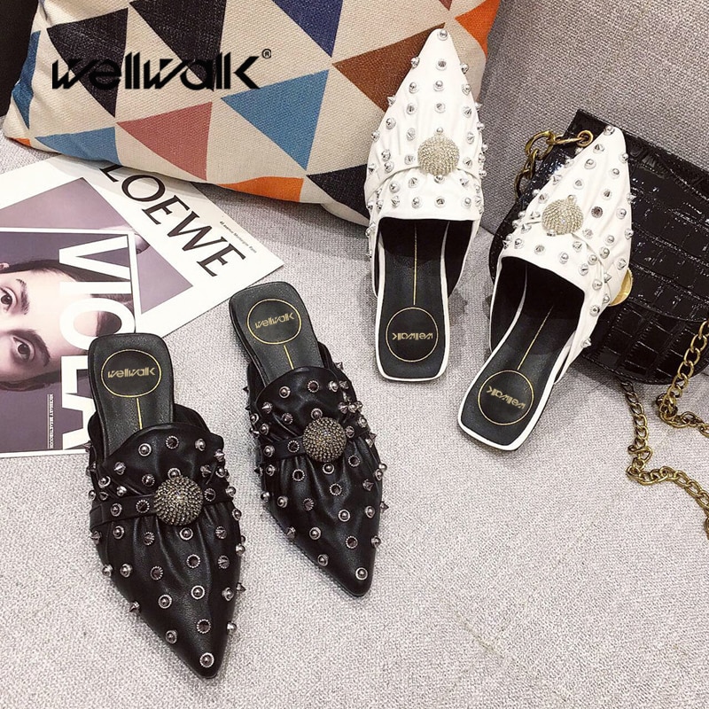 Studded Rivet Mules Slippers Women Flat Shoes Pleated Dress Slides Low Heel Female Spring Summer Loafers Slip On Shoe Woman