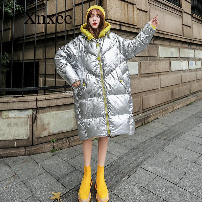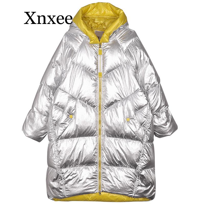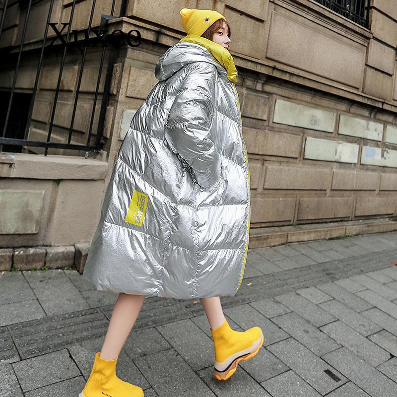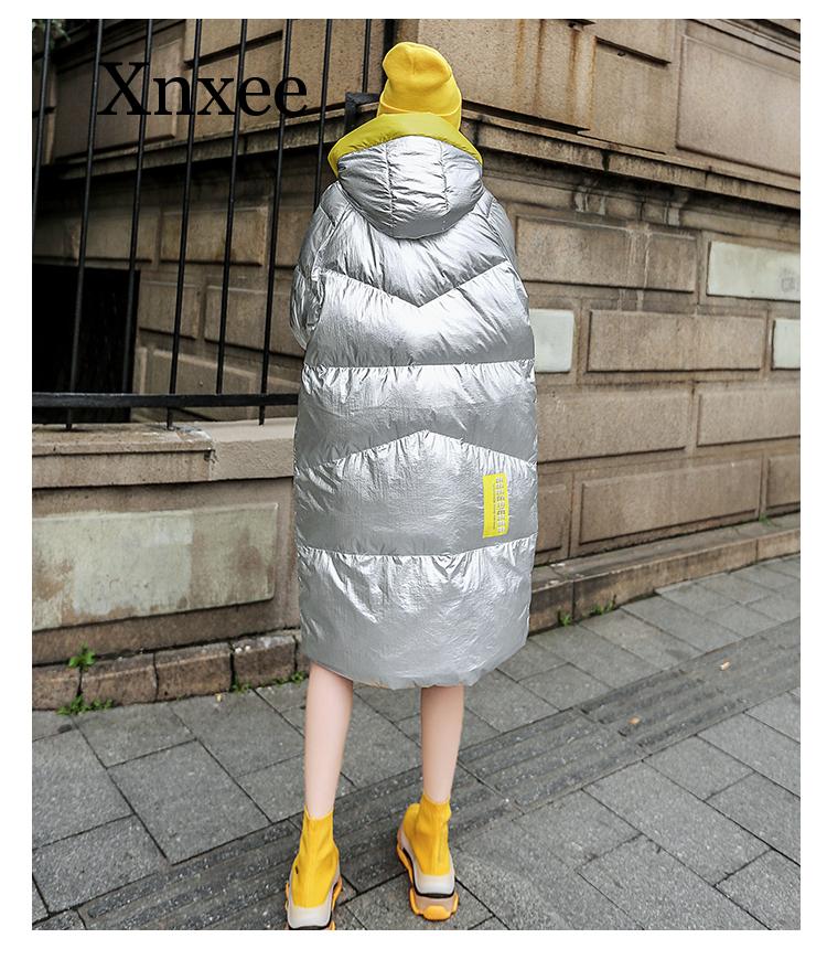 Winter Jacket Women Long Hooded Outwear Waterproof Girls’ Glossy Silver Cotton Padded Parka Warm Snow Coat Female Colour Block