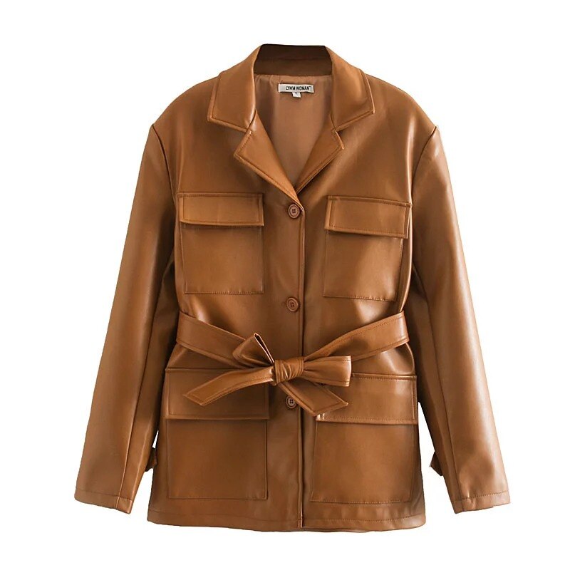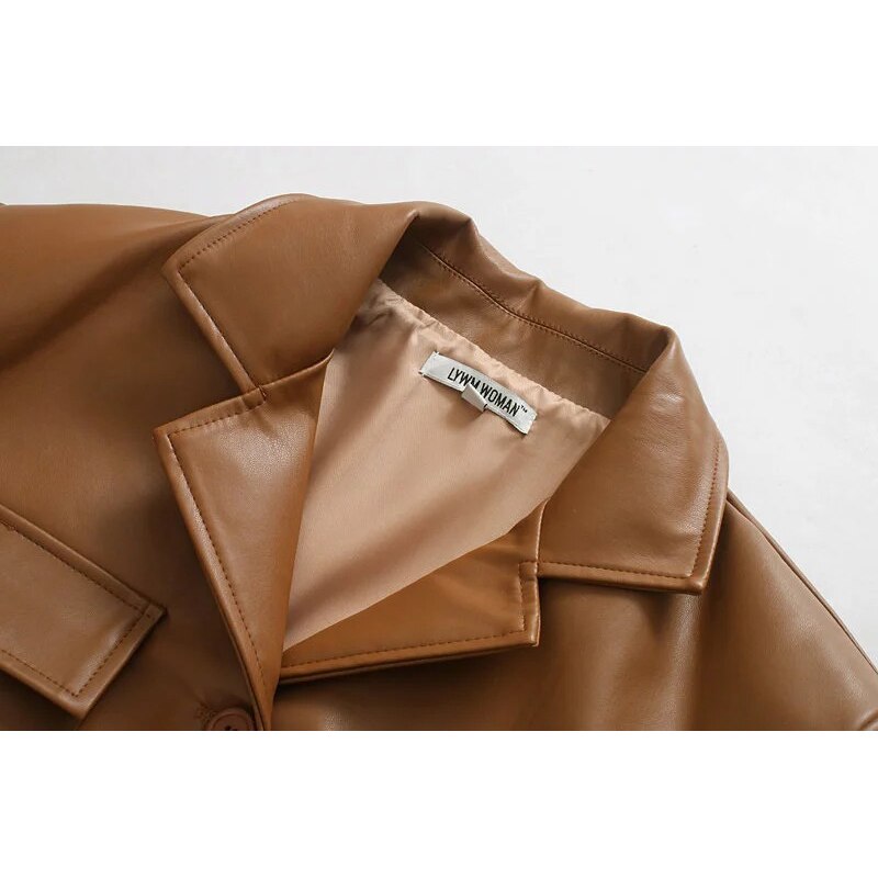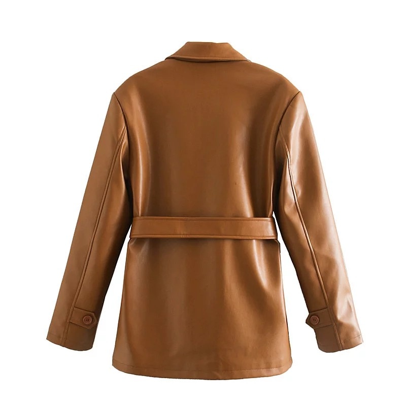Women 2019 fashion brown faux leather za jacket coat long sleeve single breasted turn collar jacket women streetwear female coat