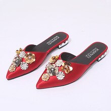Women Red Sandals Rhinstone Flower Beautiful Wedding sandal Woman Retro Pointed Toe Low Heel Shoes For Women