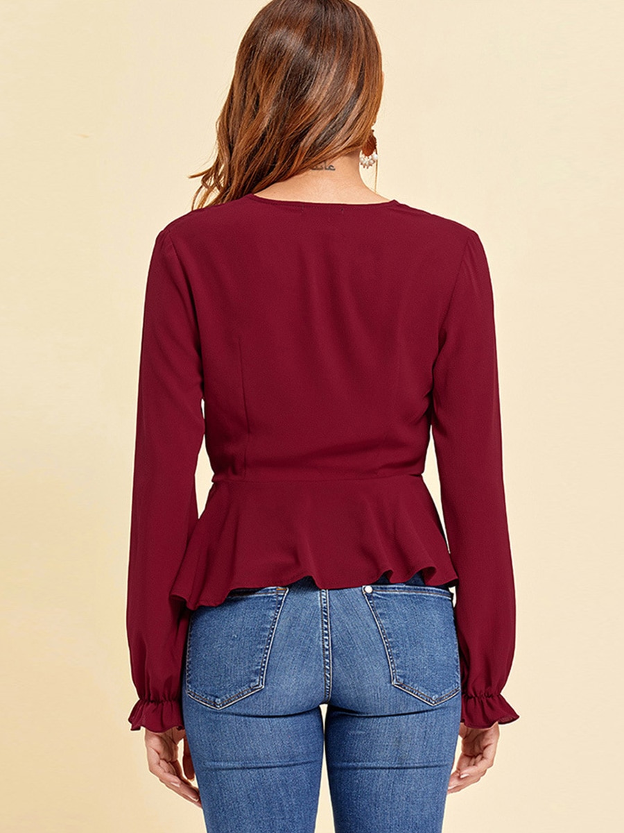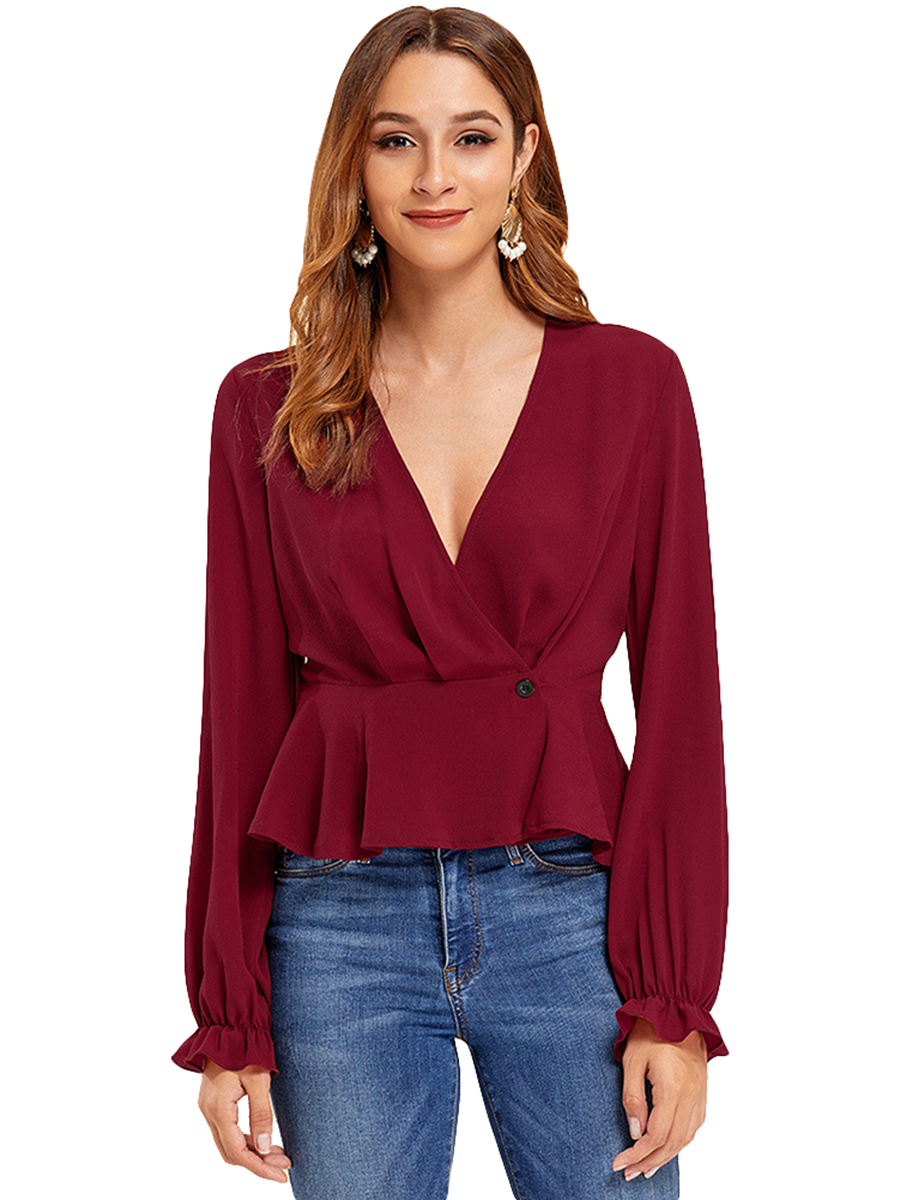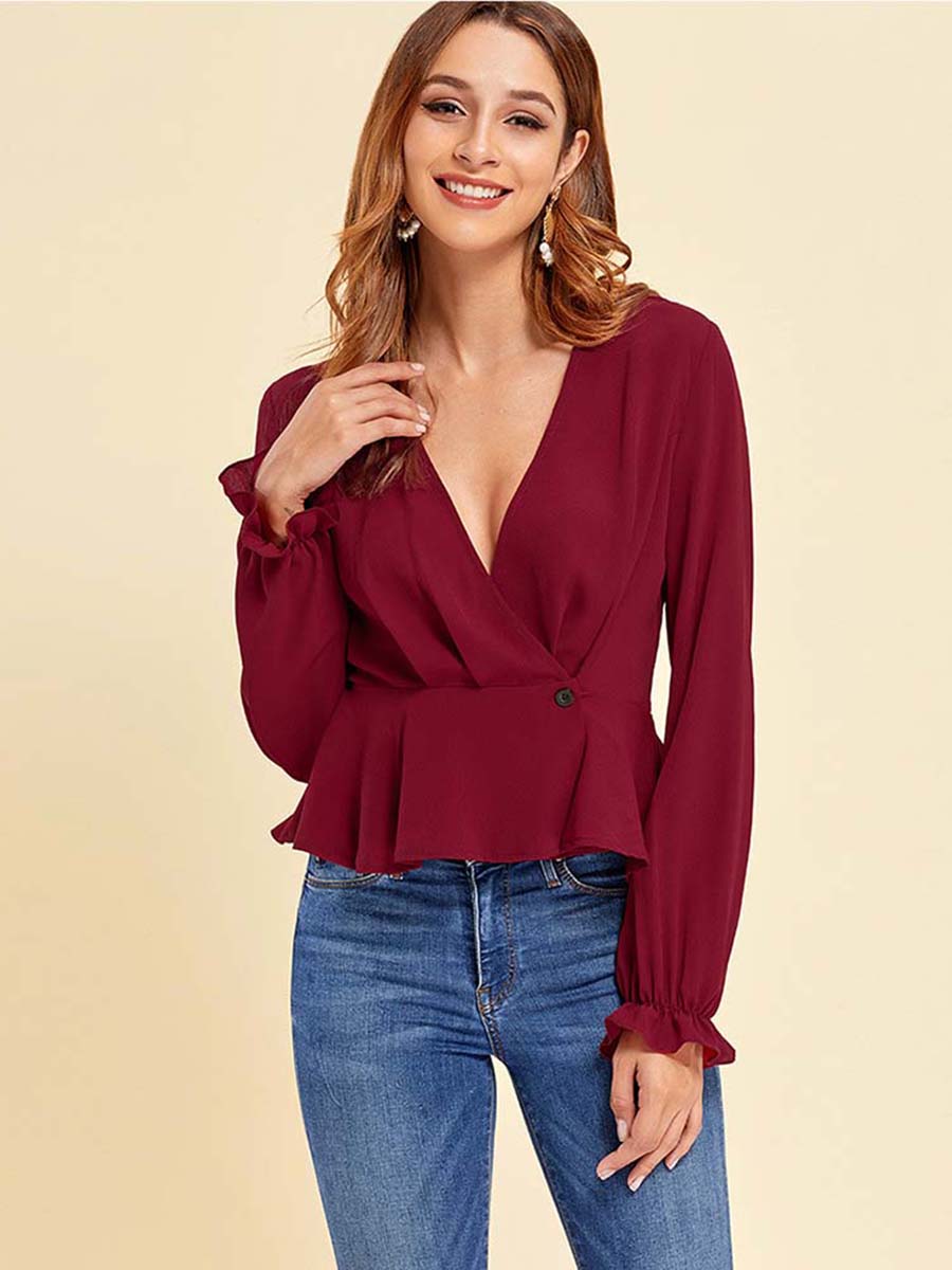 Women Short Ruffles Bodycon Blouse Hot Sale 2020 Long Sleeve V-neck Solid Color Office Lady Elegant Evening Party New Shirt