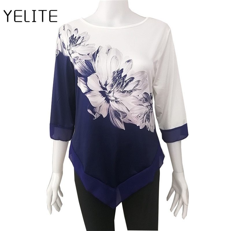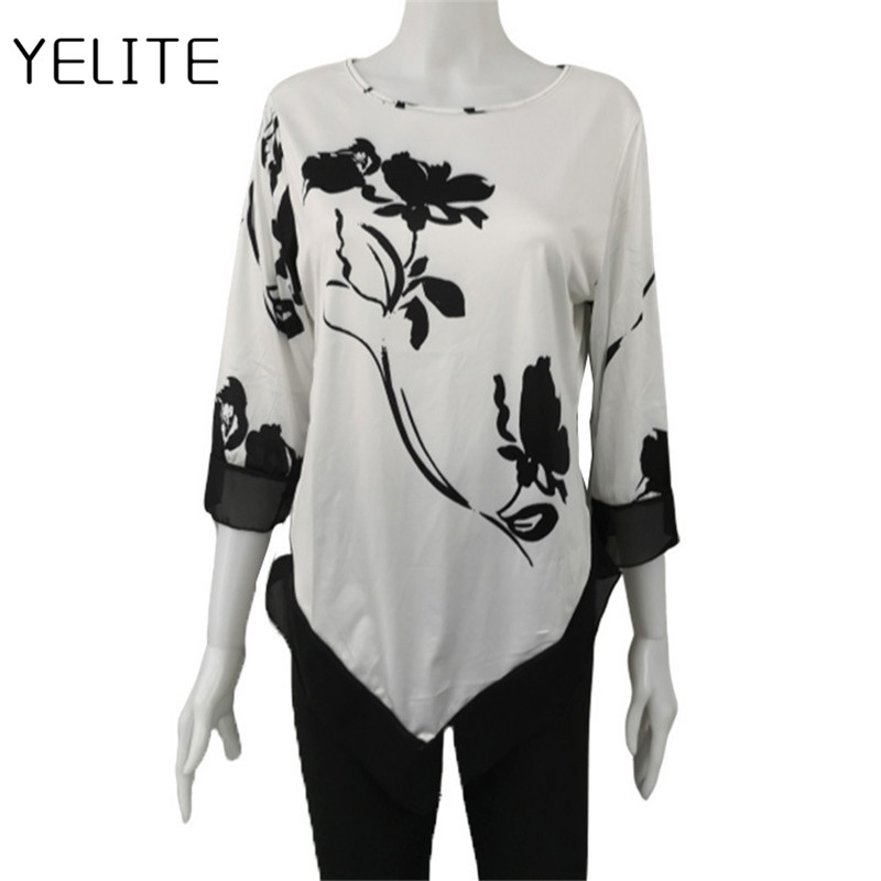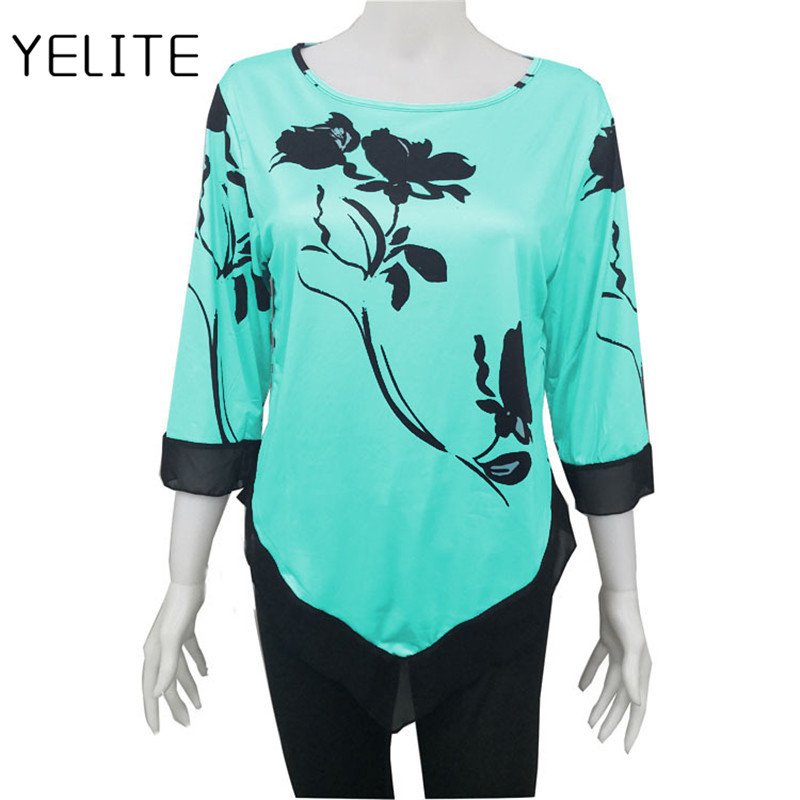 YELITE Women’s Fashion Autumn Floral Printed Long Sleeve Blouses Round Neck SweaterTops Cotton Casual Irregularity Female Tops